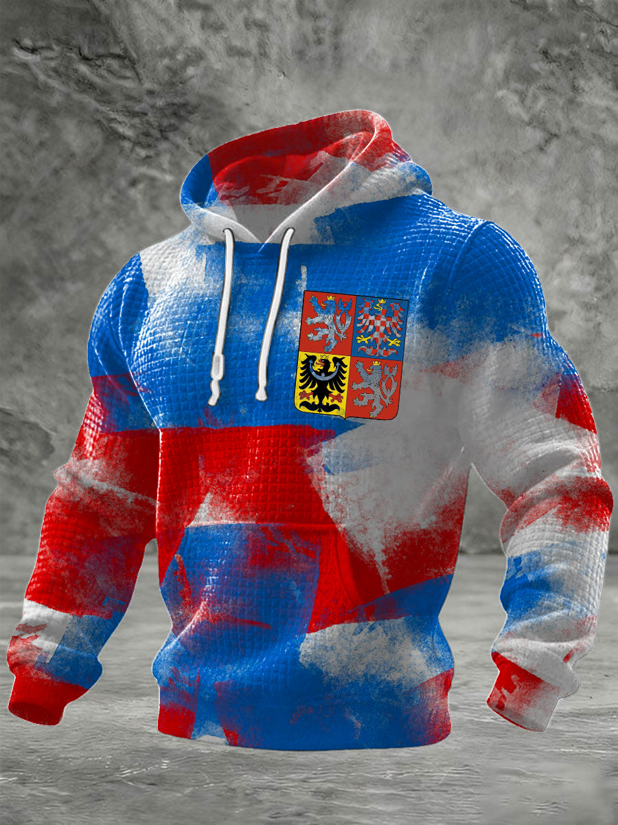 Pánské neklidné české multiemblem print vaflová pletená mikina s kapourou