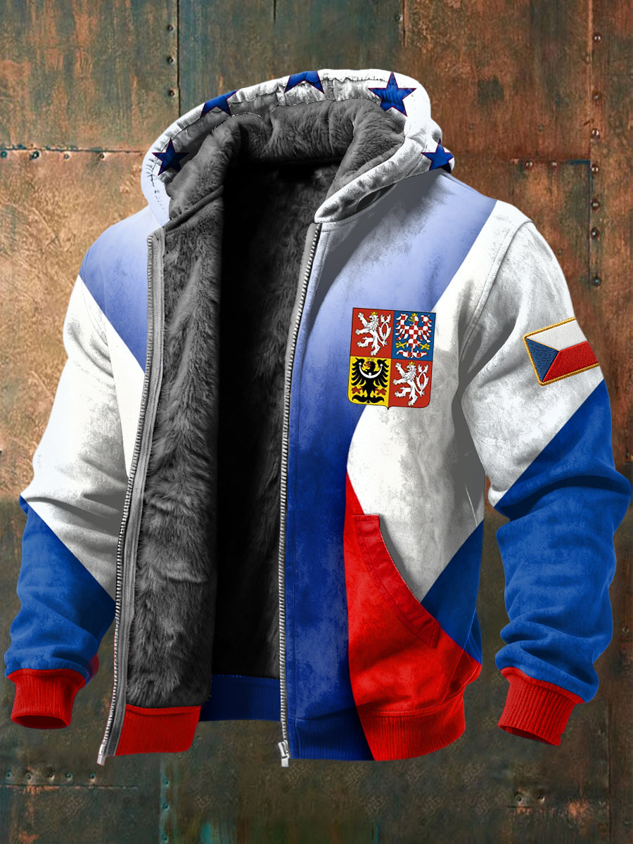 Retro barevné geometrické české vlajky fleecelemované kabát s kapucinou