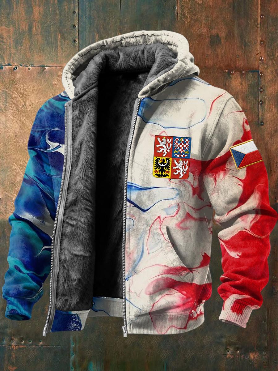 Retrobarevná texturovaná česká odznak fleecelemovaná bunda s kapucinou